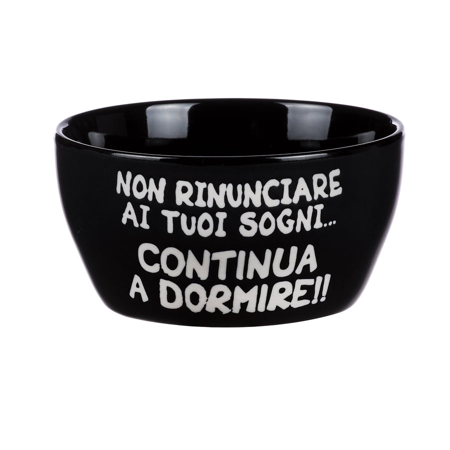 La ciotola di porcellana con una scritta motivazionale è in due colori bianco e nero....