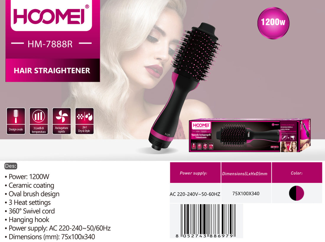 Power: 1200W Ceramic coating Oval brush design 3 Heat settings 360° Swivel cord Hanging hook...
