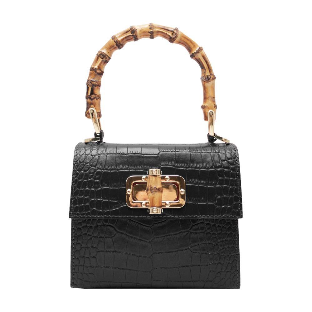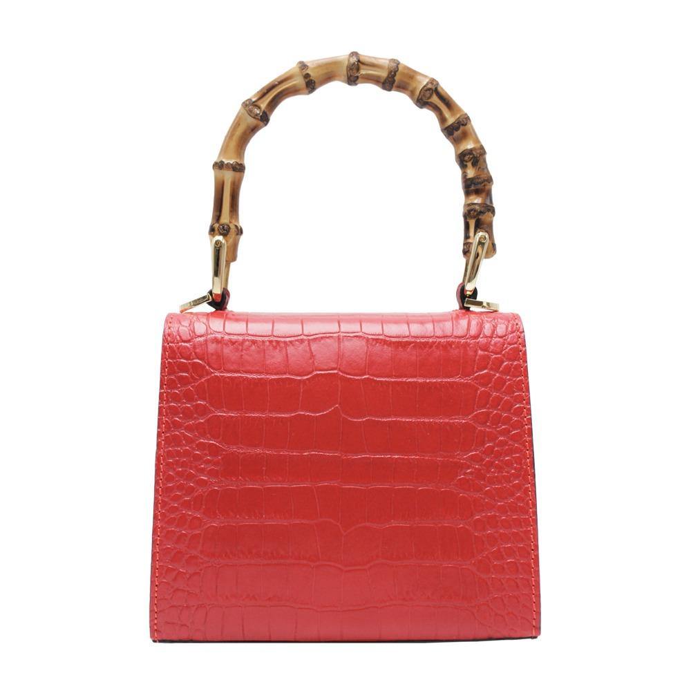Borsa rigida con manico in bamboo, la pelle presenta un bellissimo effetto cocco, interno in pelle dotato di una piccola tasca. Chiusura con patta frontale e gancio in bamboo a incastro. Provvista di una tracolla in pelle e catena di metallo.