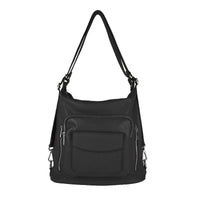 Fantastica borsa a spalla trasformabile in zaino con tracolla lunga regolabile, tasche anteriori con chiusura magnetica e cerniera, due tasche laterali con cerniere e scomparto principale e posteriore con chiusure a cerniera. All'interno sono presenti una tasca con cerniera e una taschino porta cellulare.