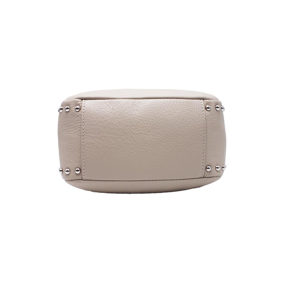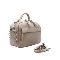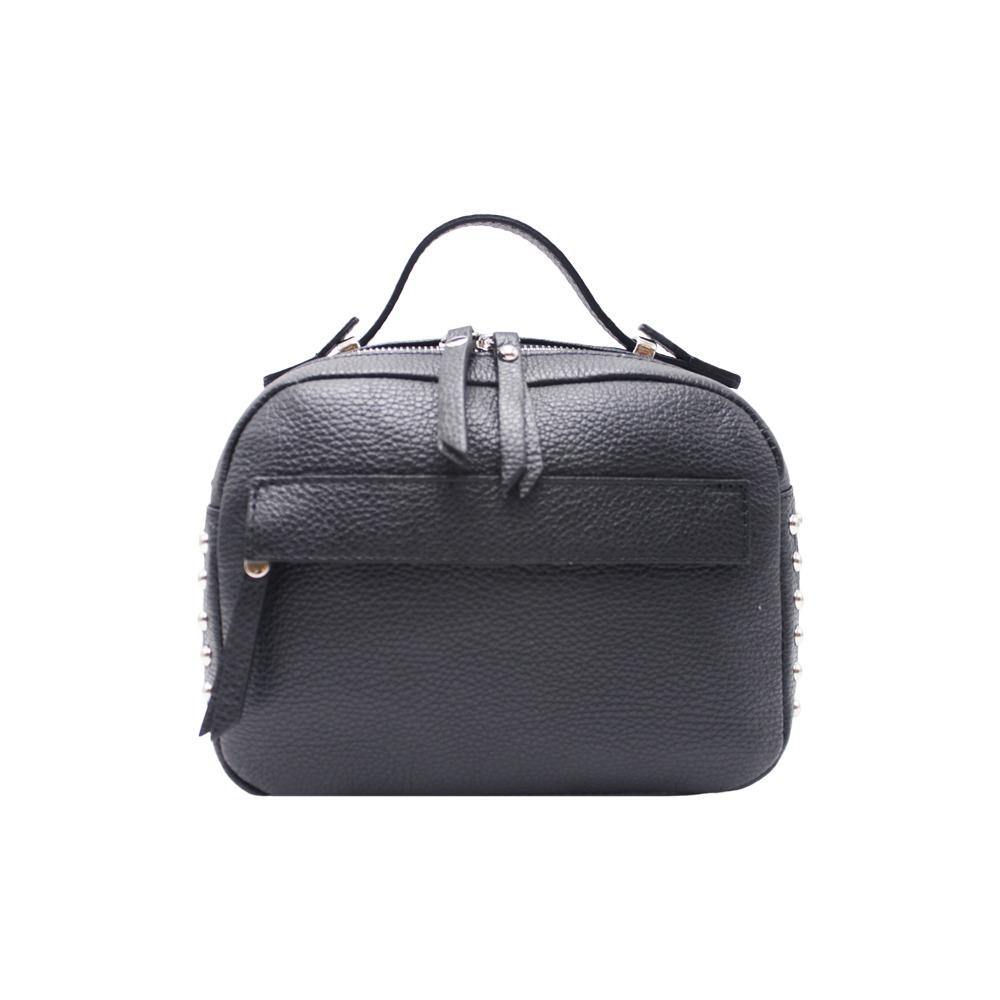 Grintosa mini borsa a mano con tracolla, in morbida pelle, sui fianchi presenta delle borchie tonde che le donano un effetto urban e ultra moderno. Chiusura con zip e doppio cursore, sulla parte frontale troviamo una tasca nascosta con chiusura zip, la tracolla è in pelle regolabile e l'interno foderato dotato di una tasca porta oggetti con cursore. Particolari in metallo argentato.