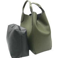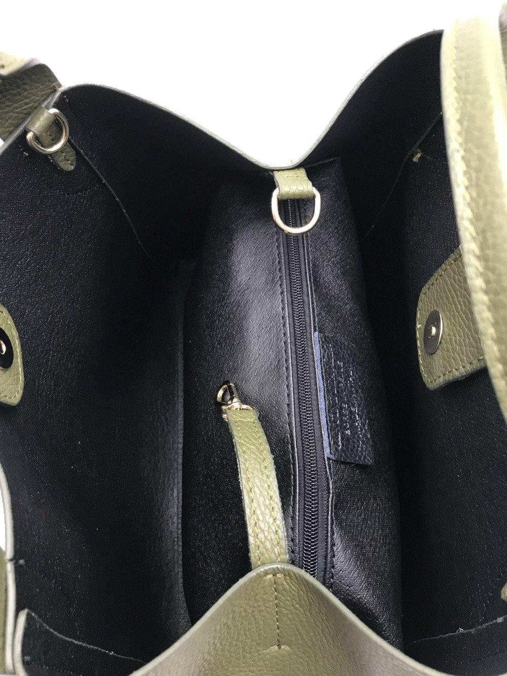 Comoda borsa in pelle con manici e tracolla larga. Include un borsellino rimovibile con cerniera. Chiusura magnetica e con gancio.