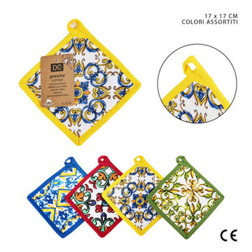 Presina quadrata in stoffa 100% cotone, con decori che ricordano le tradizionali maioliche Siciliane, con imbottitura. Leggere sulla etichetta le istruzioni di lavaggio. Disponibile nei colori Giallo, Rosso, Blu o Verde: indicare nel campo note la propria preferenza in fase d'ordine.