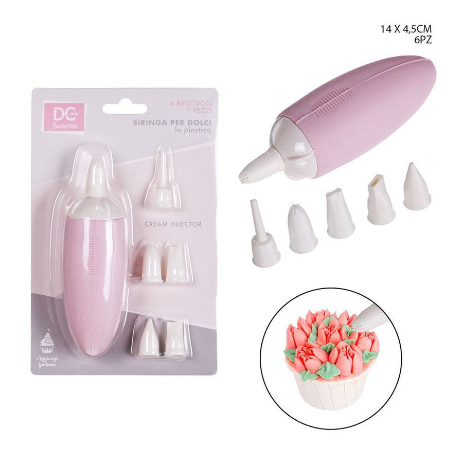 Siringa per dolci in plastica, con 6 beccucci per effettuare 6 tipi di decori diversi. Perfetta per panna montata o creme. Corpo trasparente per poter vedere la capienza effettiva e parti mobili in versione colori assortiti.
