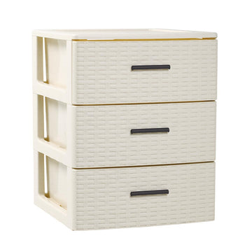 Cassettiera con tre scomparti stile rattan e colore avorio. Due pratiche maniglie, facile da pulire e capiente.