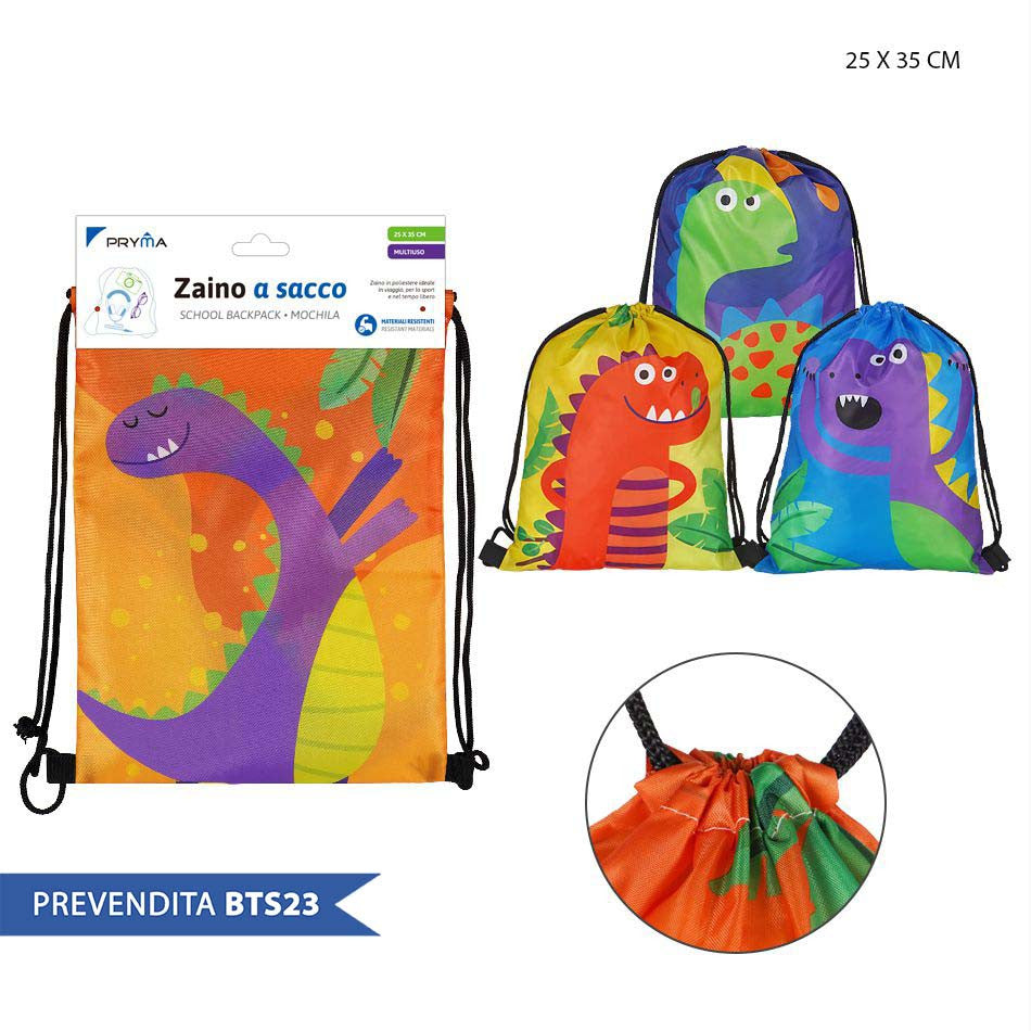 Zaino a sacco per bambini con varie fantasie e colori.
